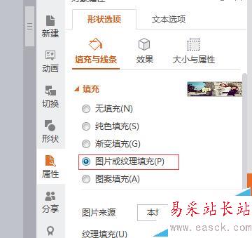 5、找到圖片與紋理填充,這時會看到右邊的縮略圖。