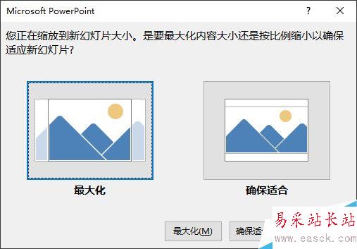 接下來又會彈出一個提示框,因為現在是空白頁面什么內容也沒有,所以選擇“最大化”或“確保適合”,結果都一樣。