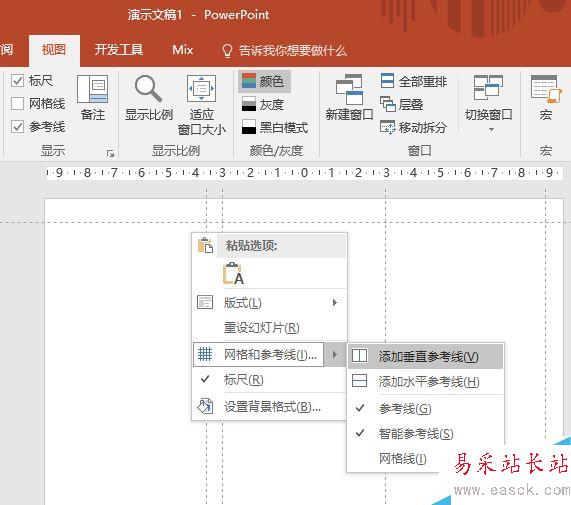 切換到“視圖”選項卡,勾選工具欄上的“參考線”和“標尺”項。此時默認出現橫豎兩條參考線。如果不夠用,可以在頁面空白處右擊,選擇“網格和參考線”,然后再選添加垂直線或水平線即可。將光標移到參考線上按下鼠標左鍵拖動,可以任意調整參考線的位置。