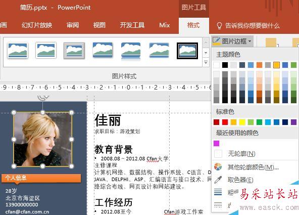 上面所制作的簡歷中,使用了一些PowerPoint的小技巧。比如簡歷中標簽的制作,先插入一個帶箭頭指示的方框,然后再右擊方框,選擇“編輯頂點”,這時就可以自由調整箭頭的方向和大小了。還有就是選中導入的照片,再切換到“圖片工具-格式”選項卡中,通過“圖片邊框”可以為照片添加各種風格的邊框。