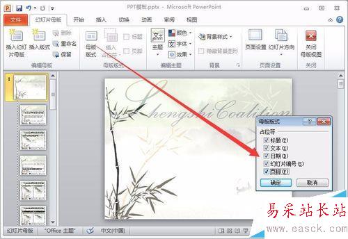 點擊插入按鈕,插入logo,水印等(圖片)并調整到最佳位置;點擊母版版式,在占位符內容下勾選上需要顯示的內容,并修改成自己的文字。如圖: