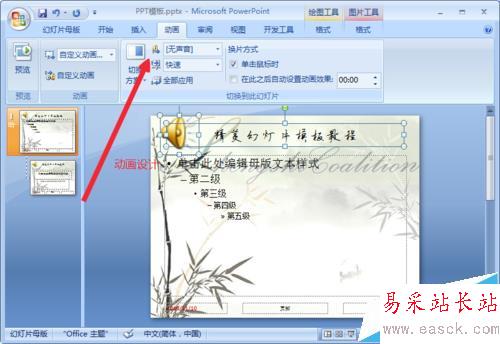 需要在整個幻燈片播放的動畫(包括背景音樂),可以在首頁模板一次性設置,全程使用;選中需要設置動畫的內容,點擊導航欄——動畫,設置效果并保存。如圖: