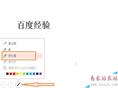 5、PPT也提供了快捷按鈕:在播放頁面移動鼠標,在左下角會有一些圖標出現,點擊鉛筆圖標,然后同樣的方法選擇即可。