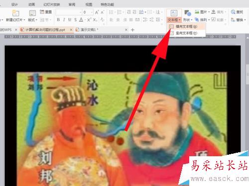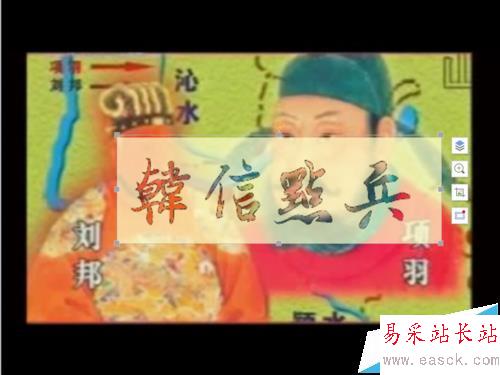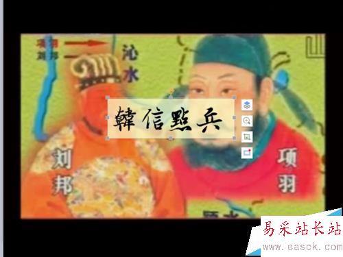 3、接著在文本框中輸入文字內容“韓信點兵”,設置字體為王羲之書法字體,字號為60,并調整文本框的位置。