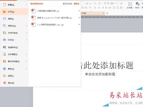 1、首先啟動wps文稿演示,執行文件-打開命令,在彈出的打開對話框中找文件所存放的位置,點擊打開。