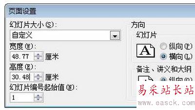 單擊菜單欄的“文件”中“頁面設(shè)置”,同樣此時(shí)會(huì)彈出“頁面設(shè)置”窗口,我們在“幻燈片大小”的下拉菜單中選擇最下面的“自定義”,然后在“寬度”和“高度”中設(shè)置厘米數(shù),如你的電腦分辨率是1440*900,75DPI的情況下,那么厘米數(shù)就應(yīng)該是48.77*30.48。