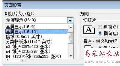 ②在彈出的“頁面設(shè)置”下面的“幻燈片大小”下拉菜單中找到“全屏顯示(16:9)”或者“全屏顯示(16:10)”后者是寬屏筆記本常見的縱橫比。一般常見的就這兩種顯示比例設(shè)置了,調(diào)整完畢后單擊確定就可以了。