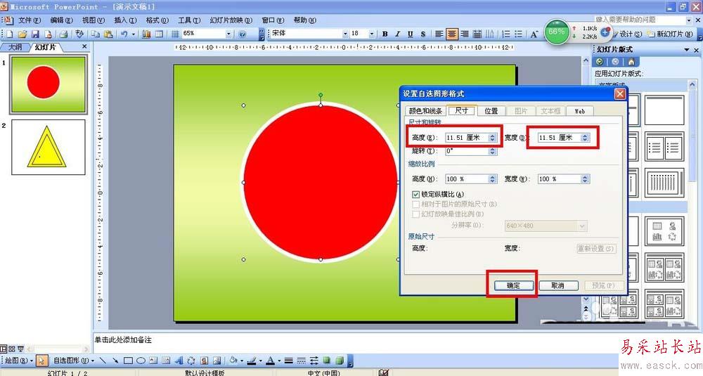 2、復制正圓再粘貼,把粘貼的正圓設置紅色并移動位置使得與原來白色正圓重合——再雙擊紅色正圓——選擇尺寸——把紅色正圓的高和寬稍微比白色正圓小一點。