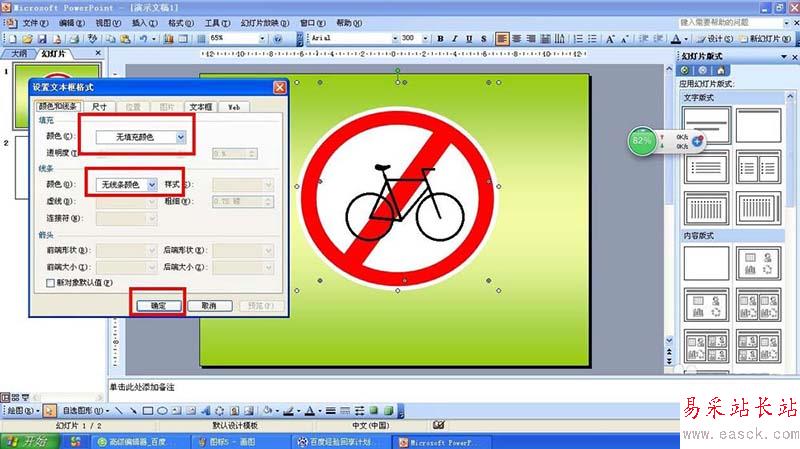 6、最后,雙擊文本框——顏色和線條,顏色填充和線條顏色都選擇無填充顏色——點擊確定。這樣一個禁止非機動車的圖標就制作好了。