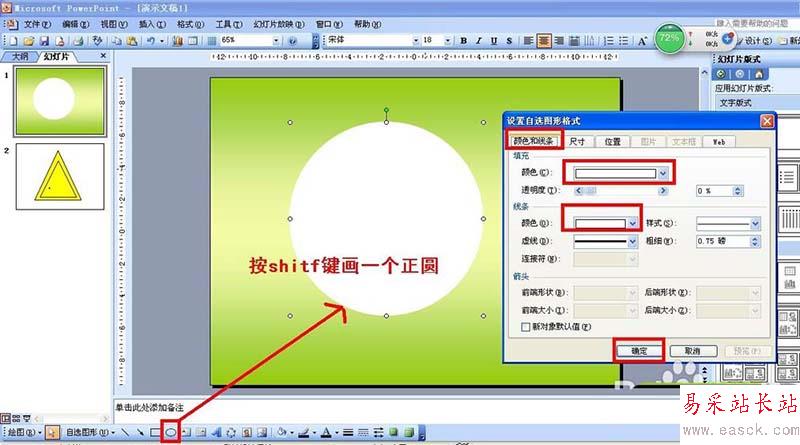 1、以禁止非機動車的交通圖標為例。打開PPT2003——在繪圖工具欄那里選擇橢圓——按shitf鍵畫一個正圓——雙擊正圓——顏色和線條——填充選擇白色,線條顏色也是選擇白色——點擊確定。