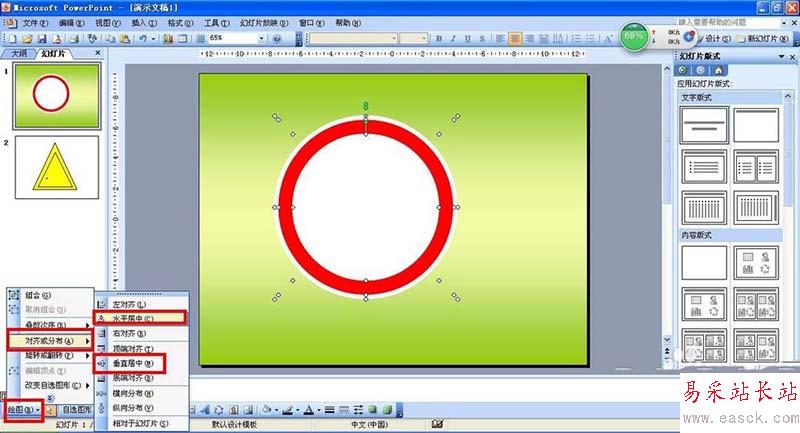 3、按照步驟1的方法再畫一個白色的小圓在紅色正圓的上方,然后全部選擇這三個圓——點擊繪圖——對齊或分布——選擇水平居中,然后再次選擇垂直居中。