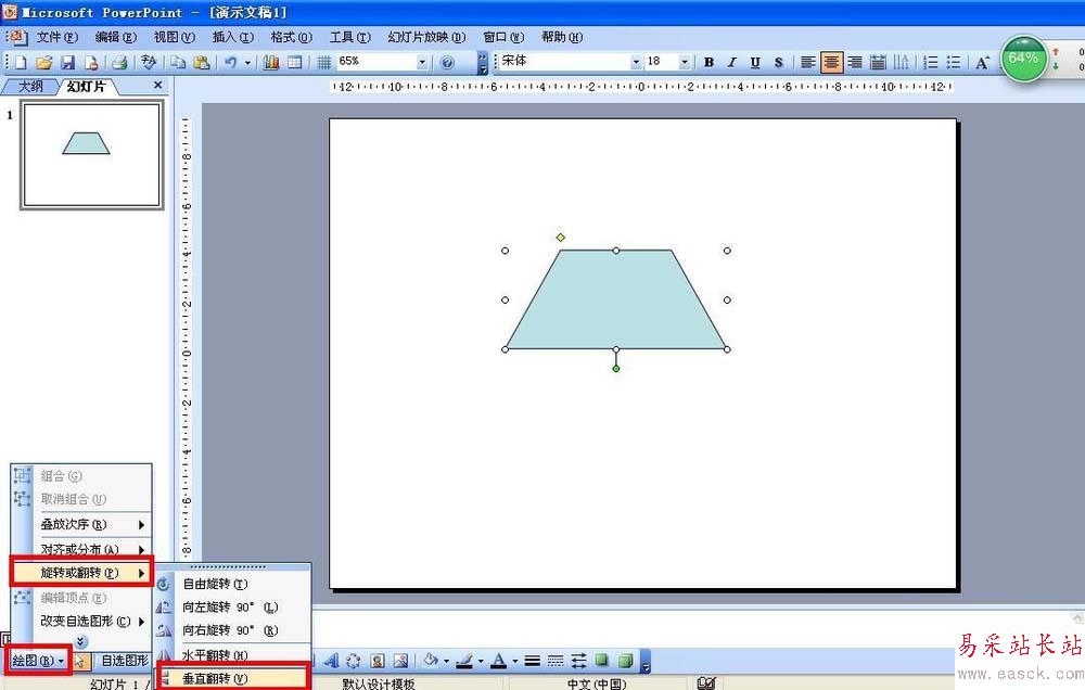 2、這時的梯形是上大下小,要倒轉過來,點擊繪圖——旋轉或翻轉——垂直翻轉,這樣就可以把梯形倒轉過來了。