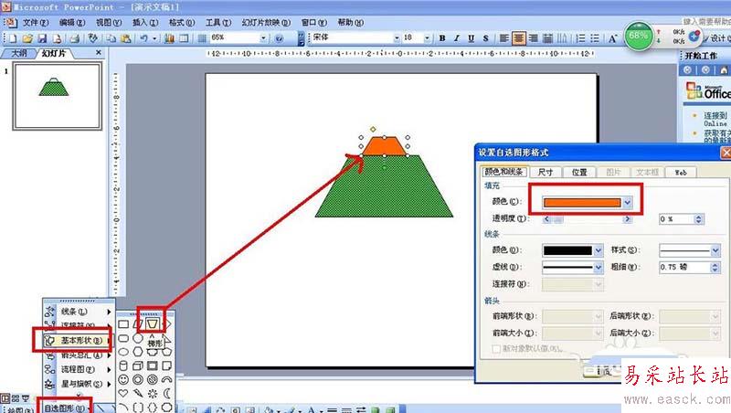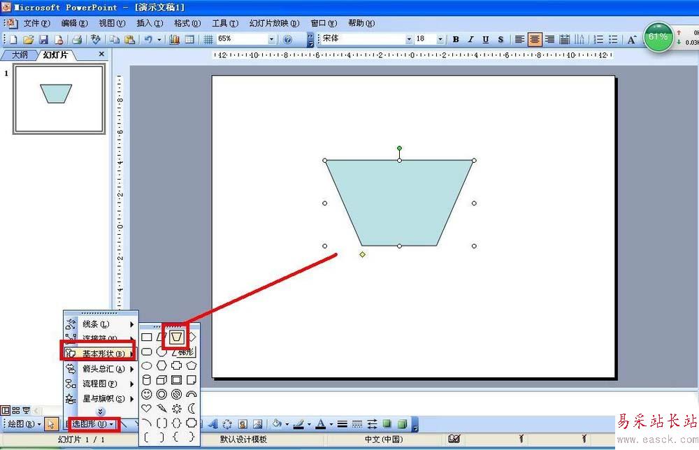 1、雙擊打開PPT,刪除編輯界面默認的文本框——點擊自選圖形——基本形狀——梯形——在編輯界面畫一個大小適中的梯形。