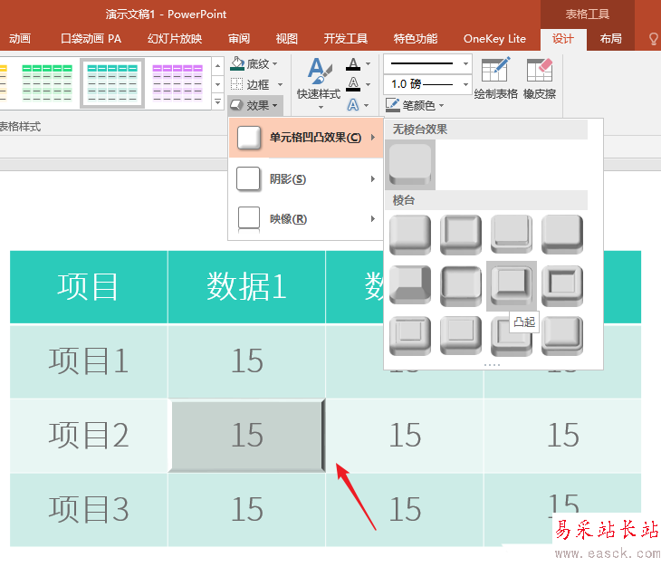 3、選中表格,點擊【表格工具】—【設計】—【效果】—【單元格凹凸效果】。