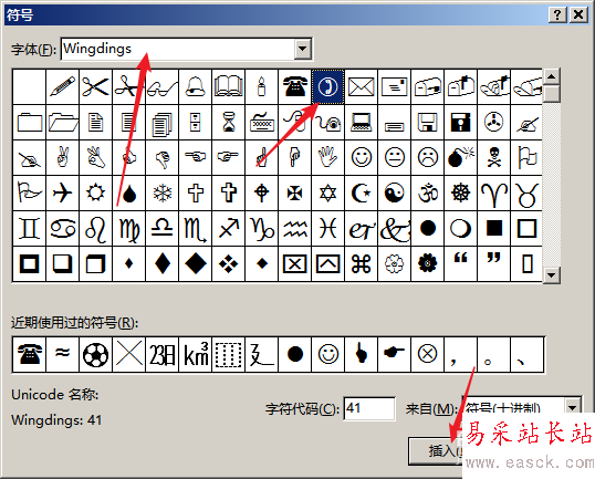 5、將光標置于中間圓形的文本框中,點擊【插入】—【符號】,在打開的窗口中,在【字體】中選擇【Wingdings】,列表中就有電話的符號,選擇后點擊【插入】。