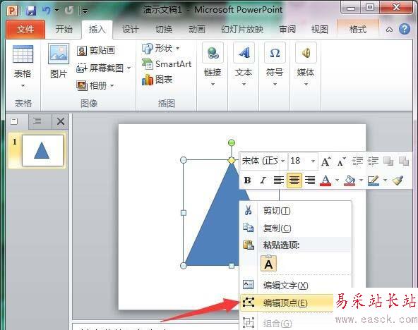 2、在工作區中拉出一個等腰三角形。右擊該等腰三角形,點擊編輯頂點。