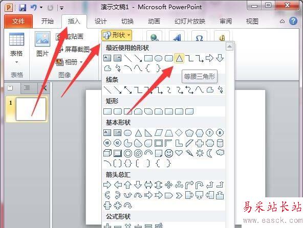 1、首先,點擊開始按鈕,打開PPT軟件。再點擊插入選項卡,點擊形狀工具里的等腰三角形。