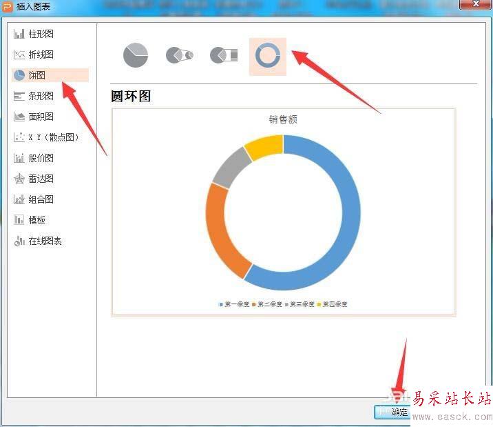 4、插入圖表窗口,選擇餅圖-圓環圖并確定。