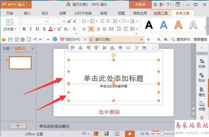 2、新建演示文稿中的標題和副標題文本框選中刪除。