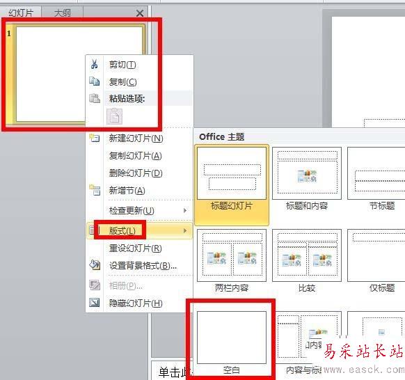 2、之后我們右擊里面的幻燈片,彈出的界面,我們點擊版式,然后我們點擊空白;