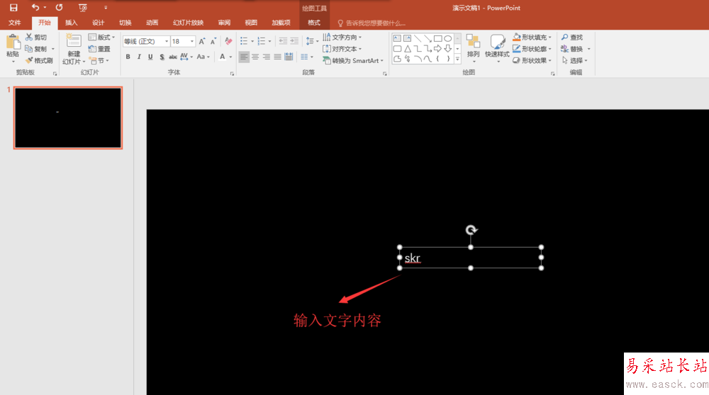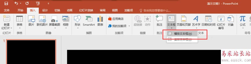 3、找到插入菜單,在插入菜單欄中找到文本框,點開文本框選擇橫版文本框;然后在幻燈片頁上插入一個橫版的文本框,并在文本框中輸入文本內容“skr”.