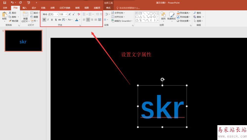 4、單擊文本框的框線選中整個文本框,然后在開始菜單中找到文本屬性設置,首先設置文本的大小,字體,顏色,字體加粗與居中等。