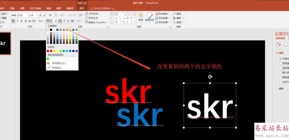 6、分別選中復制的兩個文本框,將兩個文本框的文本內容的顏色改為紅色與白色;然后分別按鍵盤上的上下左右鍵移動這兩個復制的文本框,使其與原來的文本框錯開重疊擺放;然后拖動鼠標選中這三個文本框,右鍵將其組合。這樣,我們就在PPT中做成了一個多顏色的重疊文字。