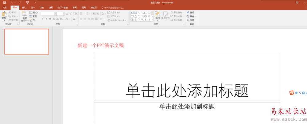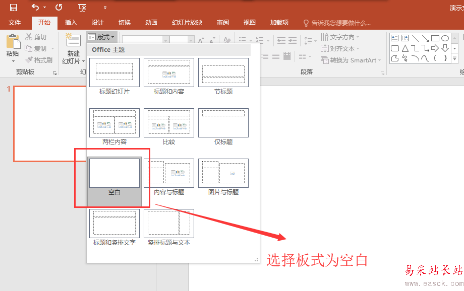 1、先打開PPT演示文稿,新建一個PPT演示文稿,然后在開始菜單中找到板式,在板式中選擇空白這個板式并單擊應用。