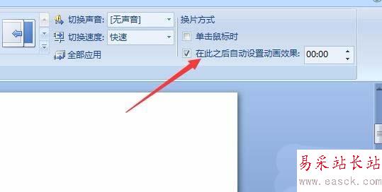 4、母版選擇好了之后,我們?cè)趧?dòng)畫中設(shè)置我們的放映時(shí)間為0.去掉單擊切換的勾。并且應(yīng)用全部