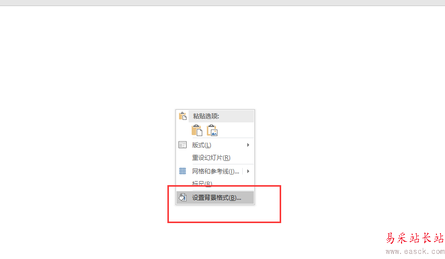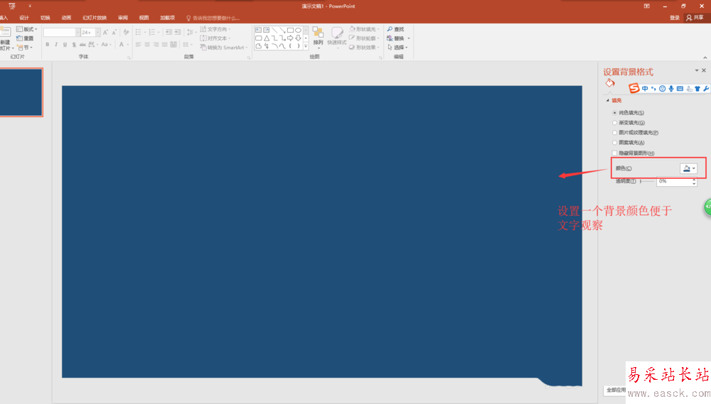 2、為了使之后我們的字中字效果更加明顯,我們先給此幻燈片更換一個背景顏色,在幻燈片頁上右鍵鼠標選擇“設置背景格式”,然后在右側打開的設置背景格式窗口給幻燈片背景設置一個暗一點的藍色背景。