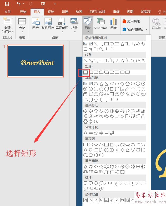 5、選擇插入菜單欄中中的形狀命令,在形狀中找到矩形,然后在幻燈片頁上繪制一個矩形條出來,將矩形條放在文本框文字內容的上方。