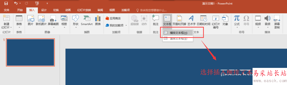 3、切換到菜單欄中的插入菜單,在插入菜單中找到文本框選項,在文本框中選擇橫排文本框,然后在幻燈片頁上繪制一個文本框出來,并輸入文字內容“PowerPoint”。