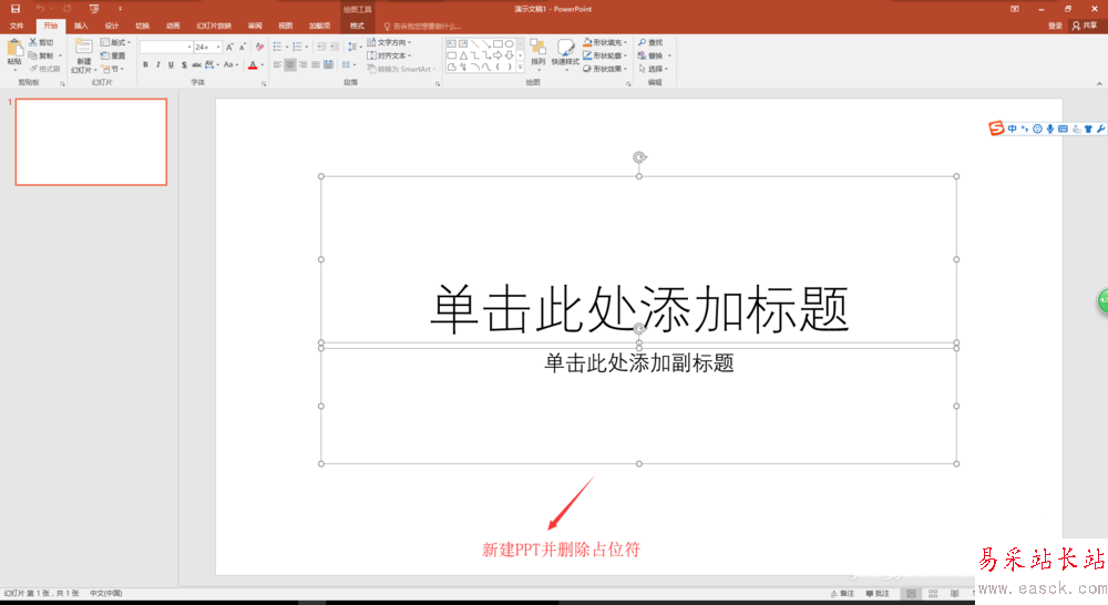1、新建一個PPT 2016版本的演示文稿,然后在新建打開的PPT 2016演示文稿中框選選中兩個自帶的占位符文本框,按鍵盤上的刪除鍵delete鍵將其刪除。