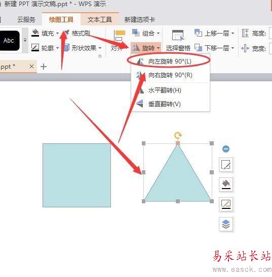 3、然后在形狀里面找到一個三角形,畫出一個三角形之后,點擊菜單欄繪圖工具里面的旋轉,點擊向左旋轉90°