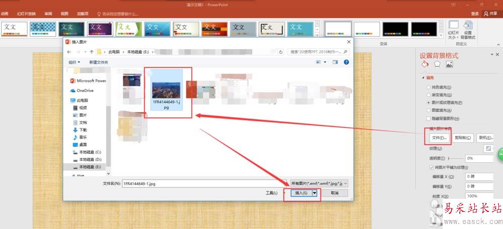 4、在設計菜單中找到設置背景格式命令,會在幻燈片的右側彈出一個設置背景格式的窗口,在背景設置中選擇圖片或紋理填充,在圖片與紋理填充的下方點擊來自文件,在彈出的文件窗口中找到并選中我們之前找到下載的圖片素材,點擊插入進行導入。
