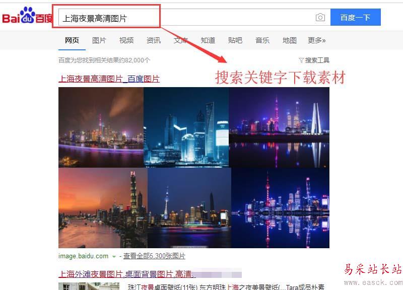 1、要制作城市夜景海報,首先要確定你選擇的城市,并且要找到這個城市的夜景素材,我們以上海為例,在百度中搜索上海夜景高清圖片,在出現的搜索結果中下載一個上海夜景的素材圖片以作備用。