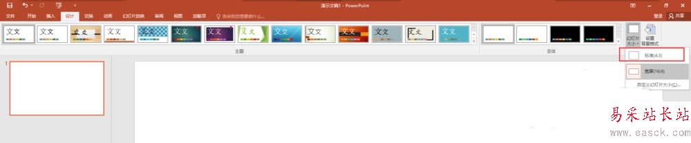 3、設置好演示文稿的板式之后,我們接下來要設置幻燈片頁的大小,因為你不論在做什么海報之前,你肯定都需要先確定海報的大小,所以我們切換到“設計”菜單,找到幻燈片大小設置,選擇標準4:3的大小設置,在彈出的窗口中選擇確保合適。