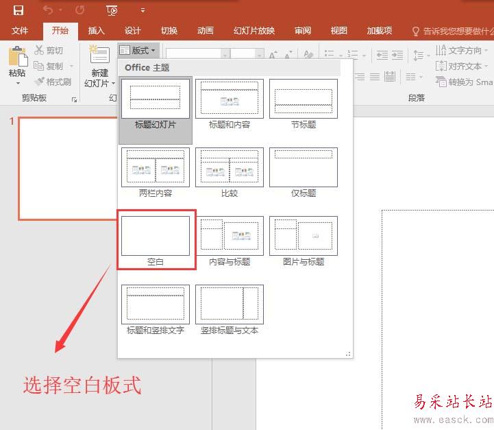 2、打開PPT 2016演示文稿軟件,新建一個空白的演示文稿,將新建的演示文稿的板式設置為空白板式。