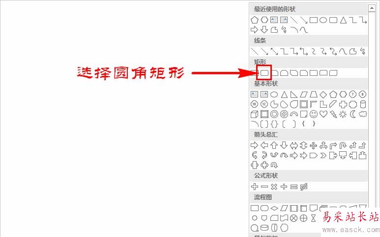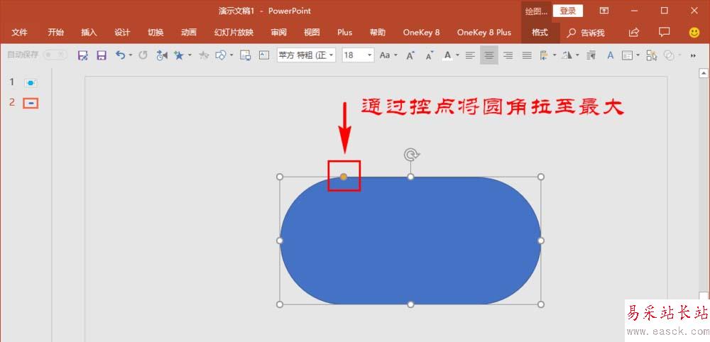 2、在形狀中,我們選擇“矩形:圓角”,然后在PPT中繪制一個圓角矩形,選中插入的圓角矩形,然后通過上面的控點,將圓角矩形的圓角拉倒最大。