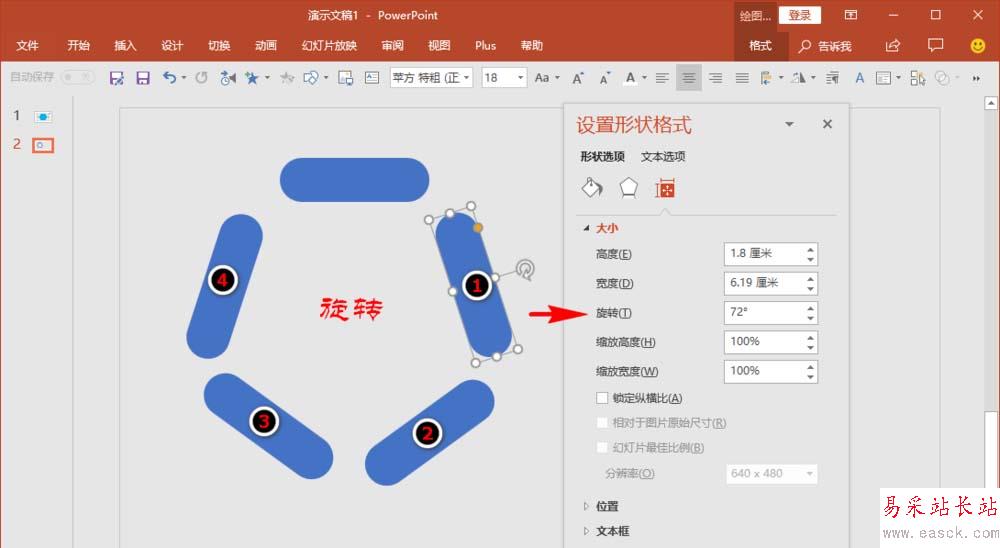 4、然后我們?nèi)绻窍胍L制出正五邊形,我們就將復制出的四個圓角矩形,通過右鍵設置形狀格式,分別將四個圓角矩形旋轉(zhuǎn)72°、144°、216°和288°。