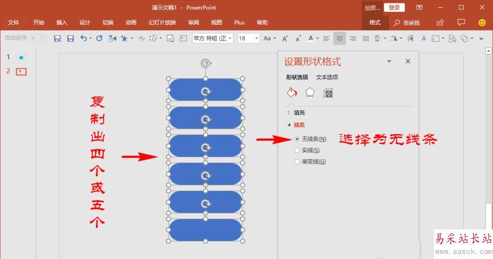 3、我們將圓角已經(jīng)拉至最大的圓角矩形復制出四個(正五邊形復制四個)或五個(正五邊形復制五個),然后將他們設置形狀格式為“無線條”。
