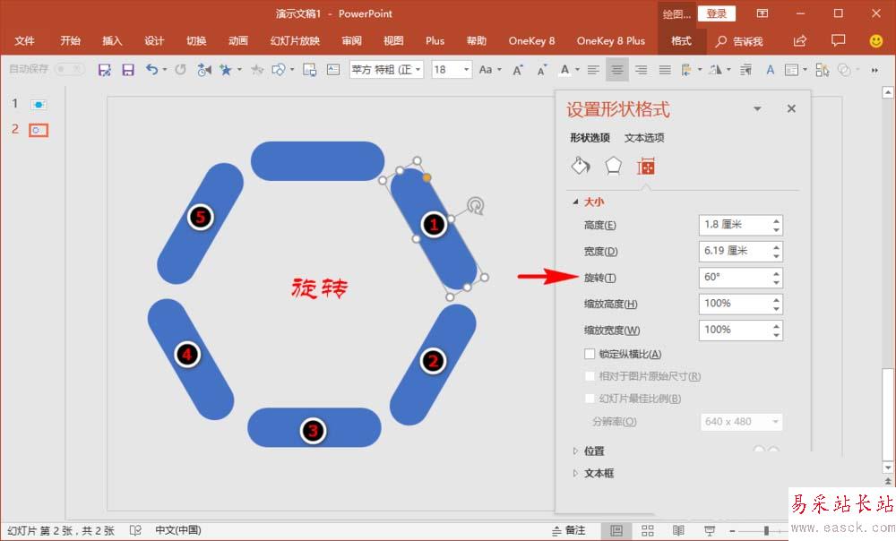 5、當然,我們?nèi)绻窍胍L制出正六邊形,我們就將復制出的五個圓角矩形其中的四個,通過右鍵設置形狀格式,分別將他們旋轉(zhuǎn)60°、120°、240°和300°,而還剩一個復制出來的矩形不用做旋轉(zhuǎn)操作,保持不變即可。