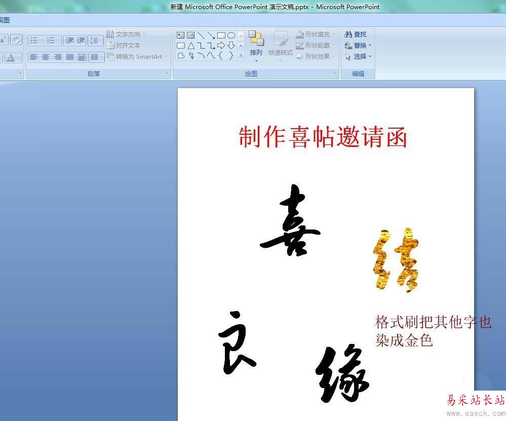 5、不用一個個去填充,我們利用格式刷把其他字也變成金閃閃的字體,這樣方便快捷