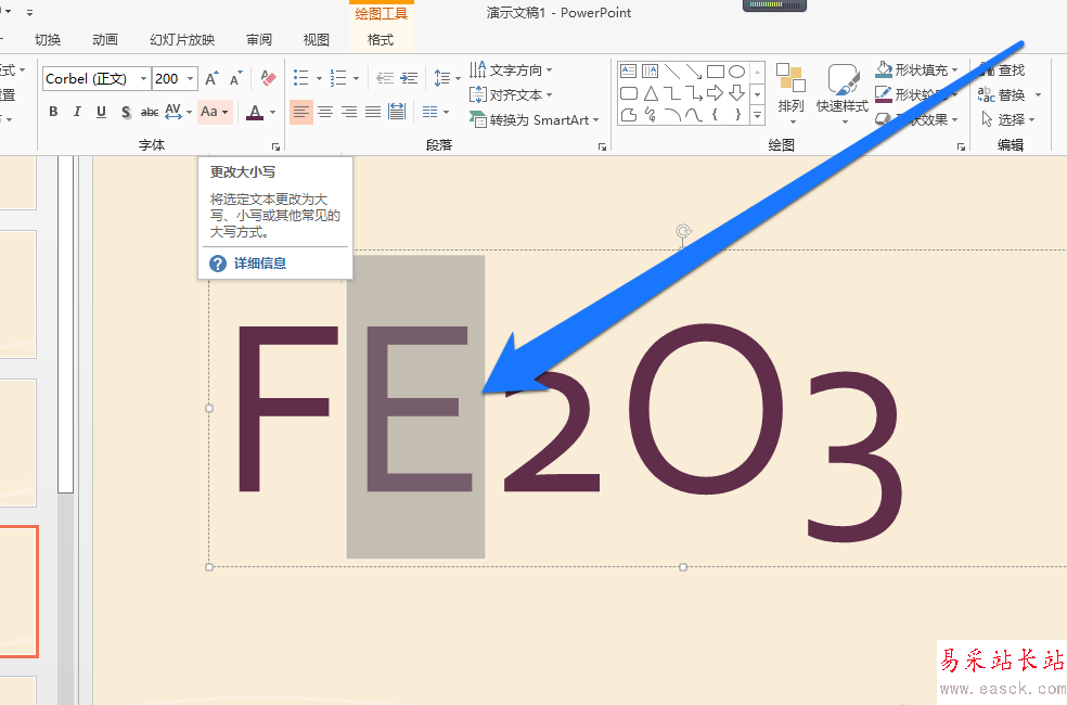 5、這時我們根據化學式的要求,將字母E進行選中,點擊開始工具中的大小寫切換功能,將字母E變為小寫e。