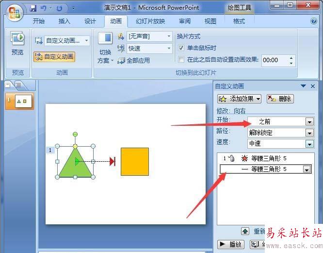 9、最后一個步驟,點擊正方形的進入動作,設置開始于之后。好了,播放一下看看,就實現了從三角形到正方形的漸變動畫。
