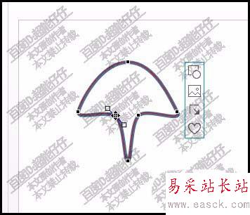 7、現(xiàn)在,已有了蘑菇的初形;鼠標(biāo)再放在蘑菇左右兩邊的頂點,同樣,點住手柄使之有一點圓弧形狀。那么,一個卡通的蘑菇形狀就出來啦。