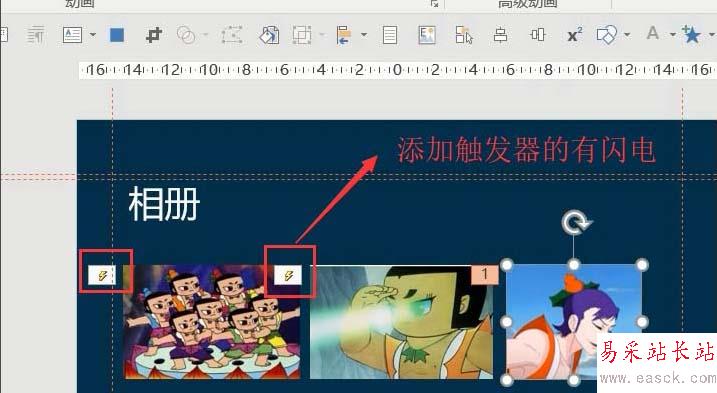 5、回到PPT中,我們就可以看到已經添加了觸發器的都會有小閃電圖標,如下圖所示