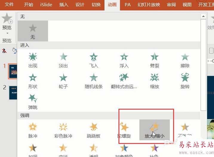 2、然后選中一個圖片的話我們點擊頂部的動畫菜單,選擇下拉中的放大縮小選項,如下圖所示