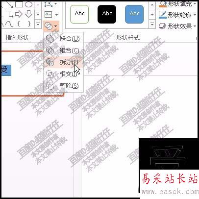 5、然后,在合并形狀這里,選擇拆分;這時,受字每一筆畫已有一個調節框。