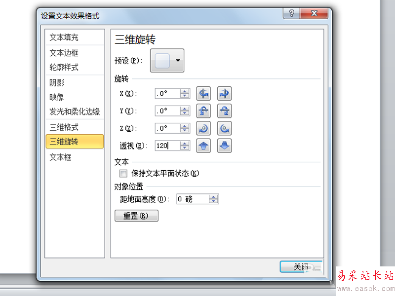 7、切換到三維旋轉,預設設置為前透視,透視修改為120度。